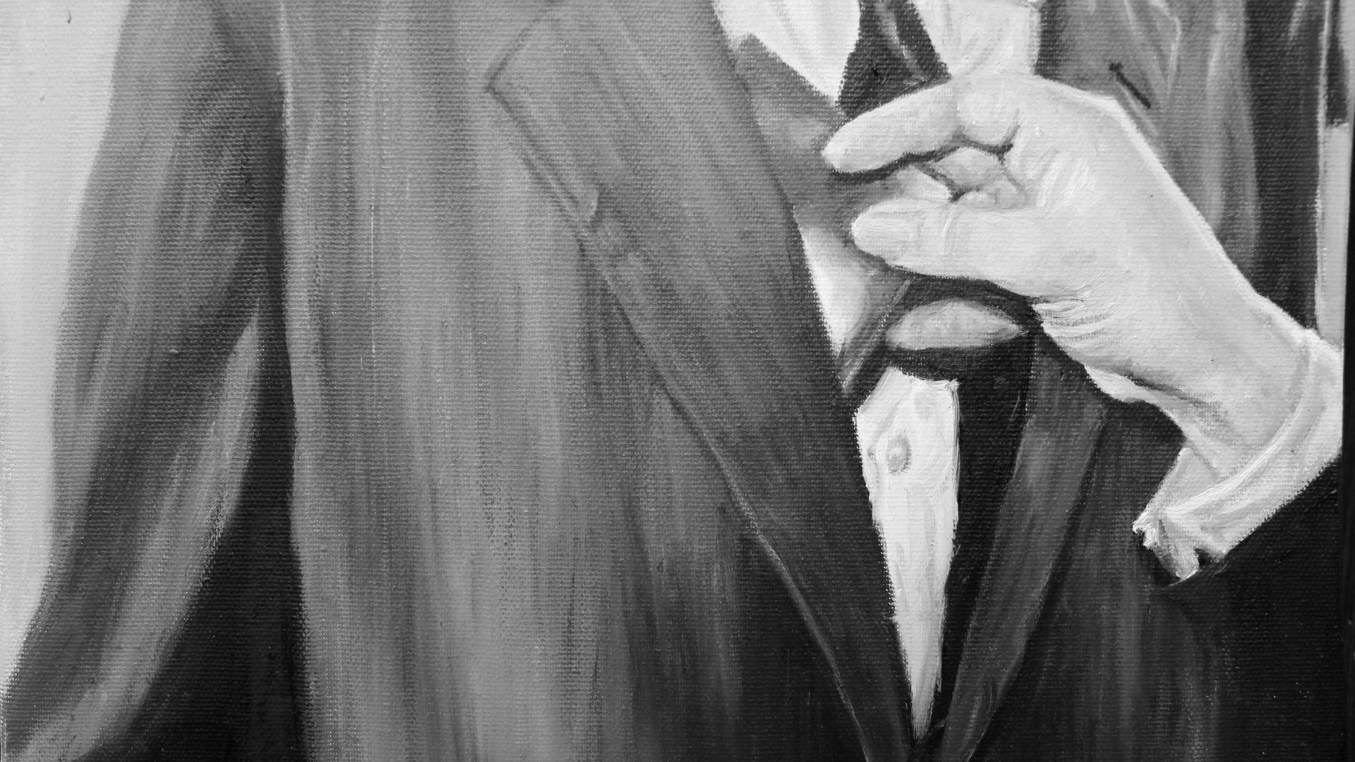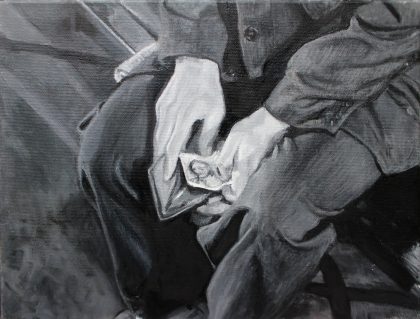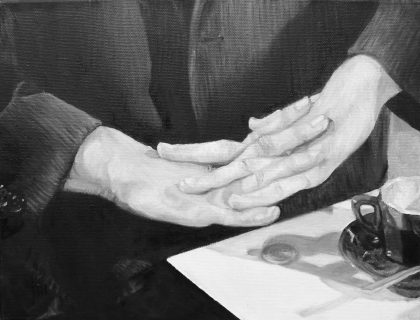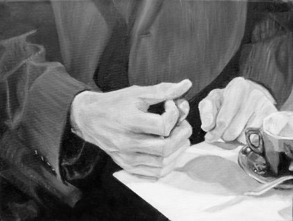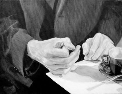 Le plan fixe, obligerait le peintre à reproduire la tasse de café XXX fois, au même endroit sur la toile, identique (les simples détails changeant seraient l’influence des ombres que la main porte sur la tasse). J’entends les peintres hyper-réaliste glousser et se dire qu’il y aurait bien des technique de reproduction de l’image sur la toile pour guider la peinture… mais ceci reviendrait à faire du cinéma… peindre d’un geste de la main sûr et maitriser la « même image » X fois serait plus proche du jeu d’ acteur… je n’ai finalement sélectionné que quatre images évoquant la manipulation, le mouvement. (et « seulement » 4 tasses de café). Les deux autres images de la série montrent, pour la première, la main de Kassagi qui montre comment subtiliser un porte-feuille (sur la personne de Michel) et Michel froissant les Pascal qu’il vient de subtiliser à un type dans le métro.). La main de michel «l’apprenti » est une main de pianiste au doigt fins et longs ; la main de Kassagi, le pro, plus petite, plus reliée (le contraire de déliée).